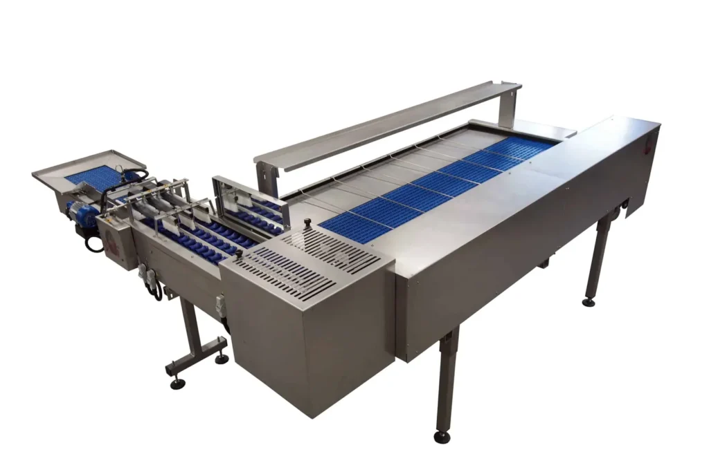 An innovative solution which carries out the delicate operation of moving the eggs from the exit of the scales to the hand packing table.